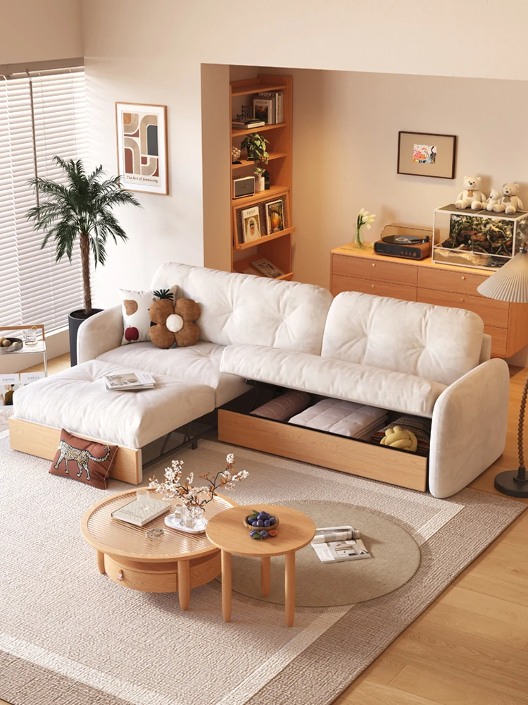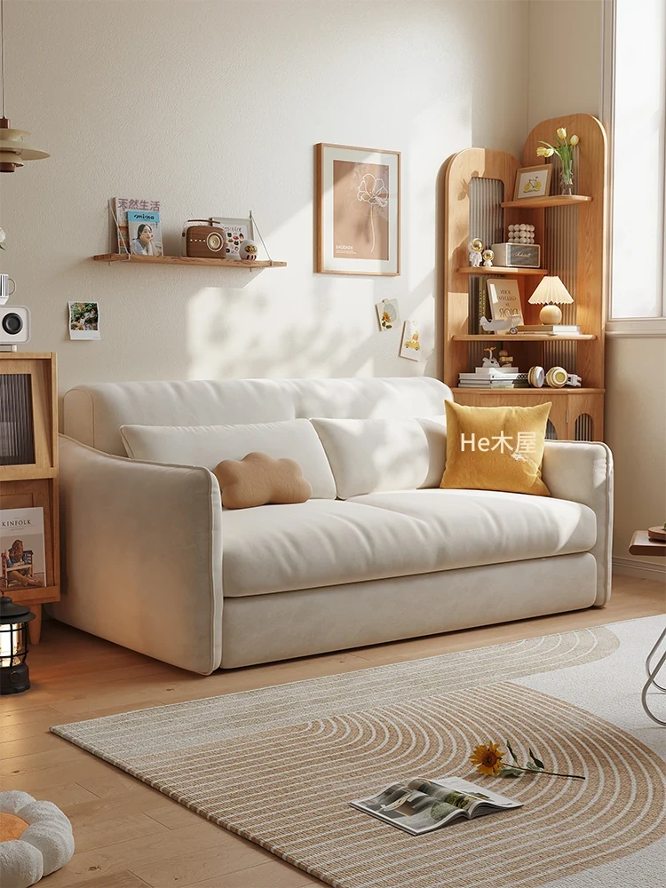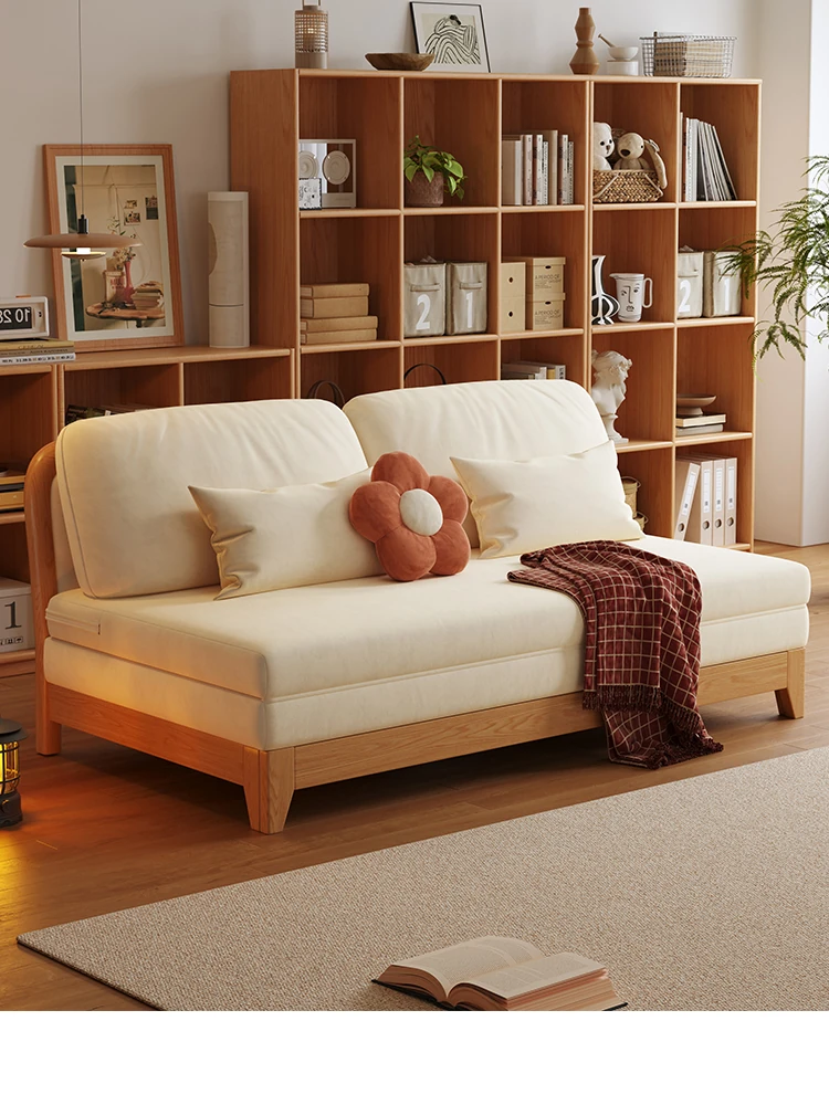 He木屋の天然木製ソファベッド - 雲のような快適さを提供する多機能収納ソファ!小さなリビングにぴったりなクリーム風デザインで、優雅な空間を演出します。ソファとベッドの2way仕様で、便利さを実感してください。