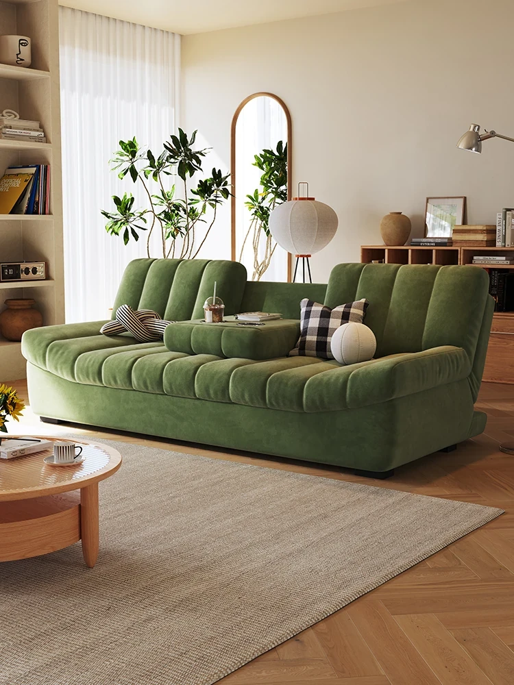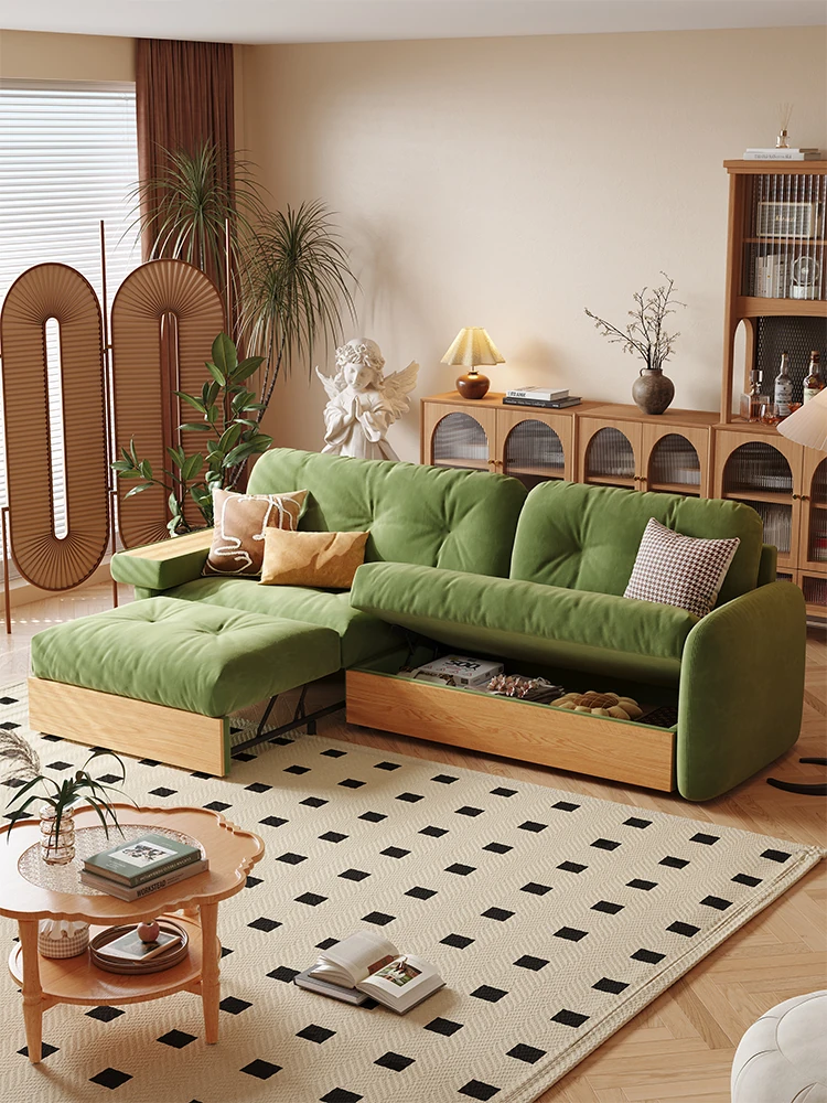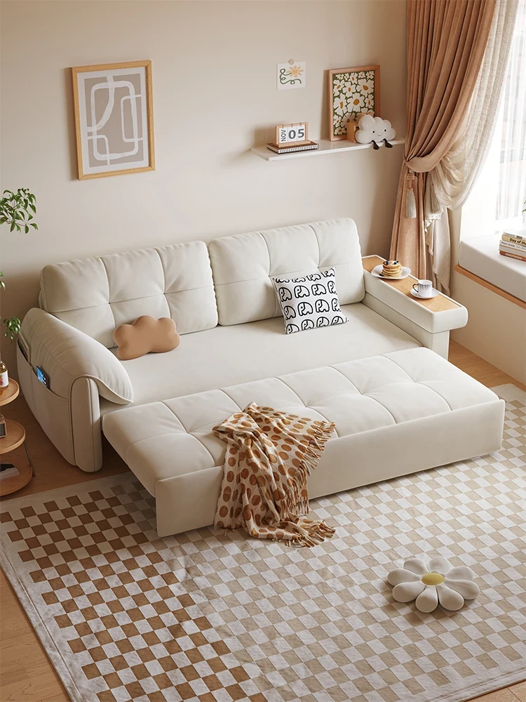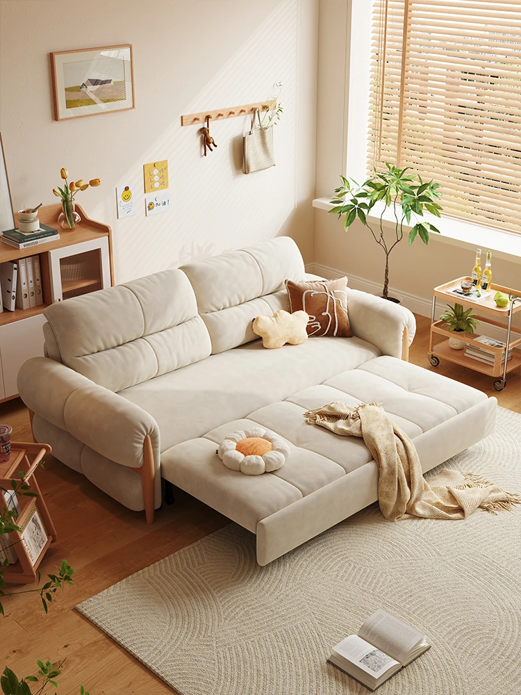 アンティーク調の木製クリーム風伸縮式折りたたみソファベッド - 収納機能付き、リビングルームにピッタリな象耳デザインの多機能ソファ。快適さとスタイルを両立した一体型ソファです!