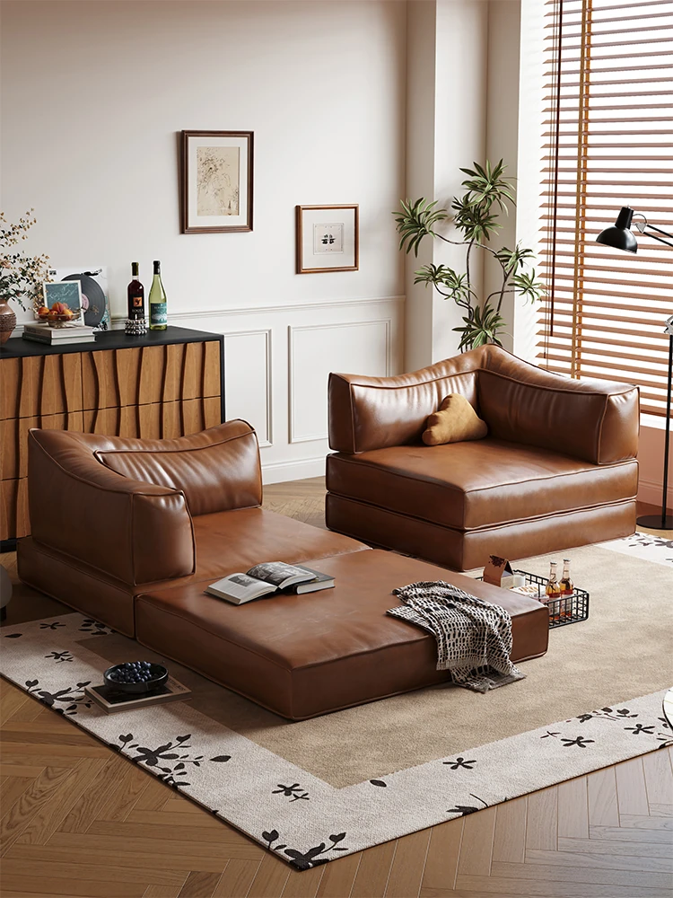 ヒノキの折りたためるレトロ風ソファベッド - 中古スタイルの耐油ワックス生地で、コンパクトなリビングに最適!モジュラータイプで使い方自由自在、落ち着いた雰囲気を演出します。