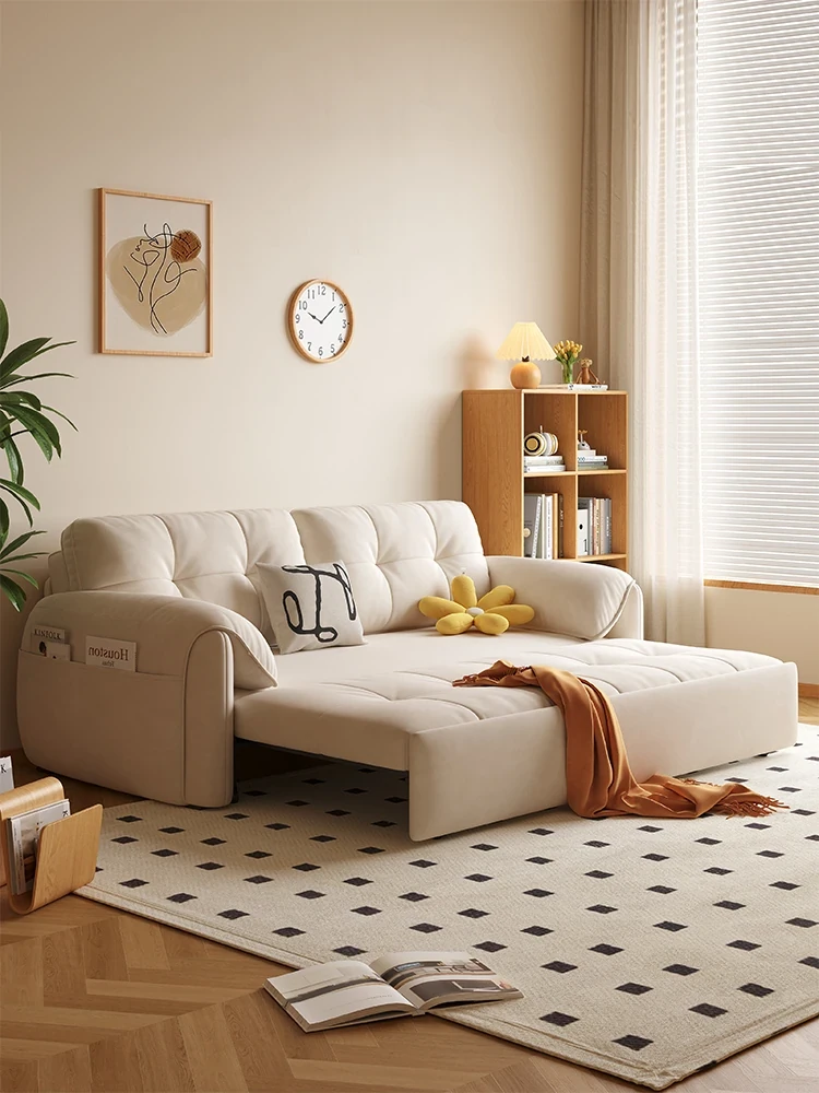 ヒー木の家のクリーミーな風合いの小型洗練ソファ!リビングにぴったりな2人掛けファブリックソファ、折りたたみ式の二用途デザインで、フェンディ風のソファベッド!快適さとスタイルを両立させた一品です。