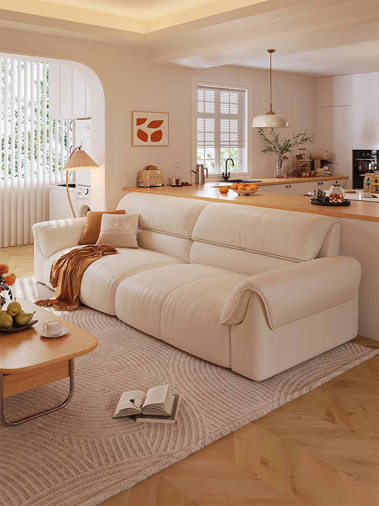 ヘ木の家 モダンミニマリストリビングルーム 本革ソファ クレーム色 小型リビング向け ダイレクト配置 エレファントイヤーソファ - スタイリッシュなデザインで心地よい空間を演出!