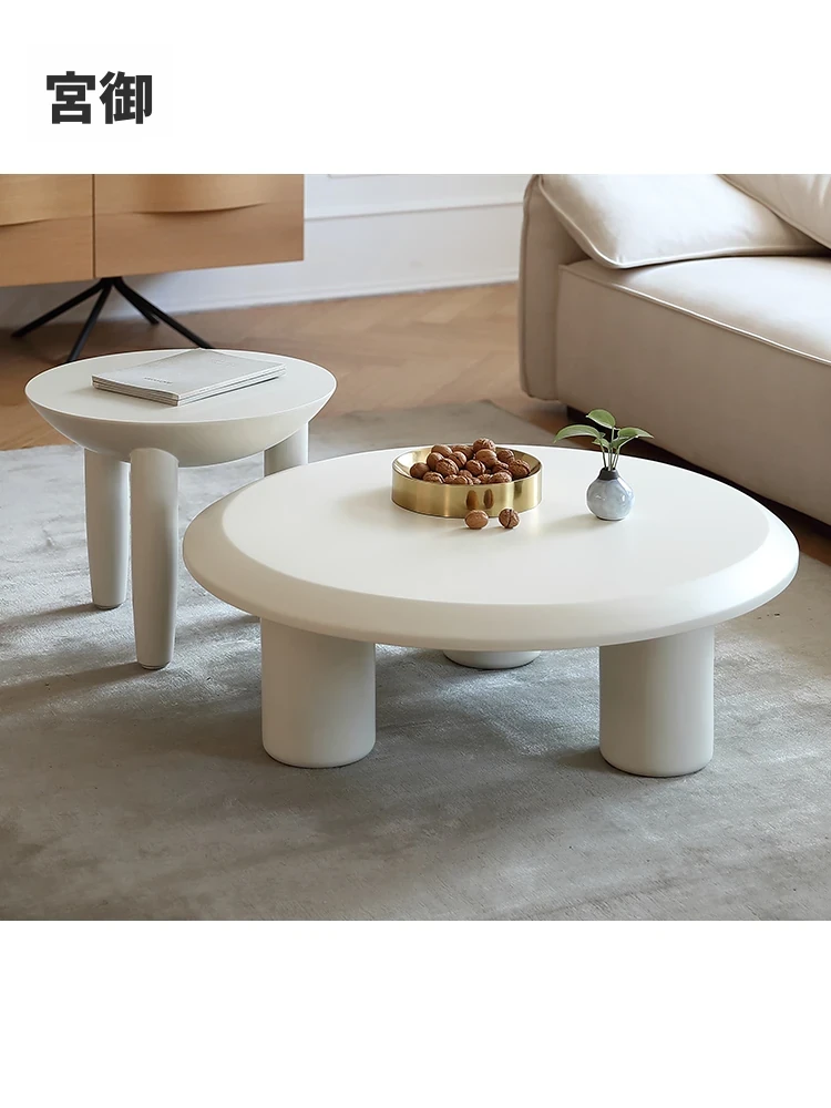 宮廷風テニスサイズの円形木製クリームカラーコーヒーテーブルセット - イタリアンミニマルデザイン、狭い空間にぴったりなトレンディなリビングインテリア!