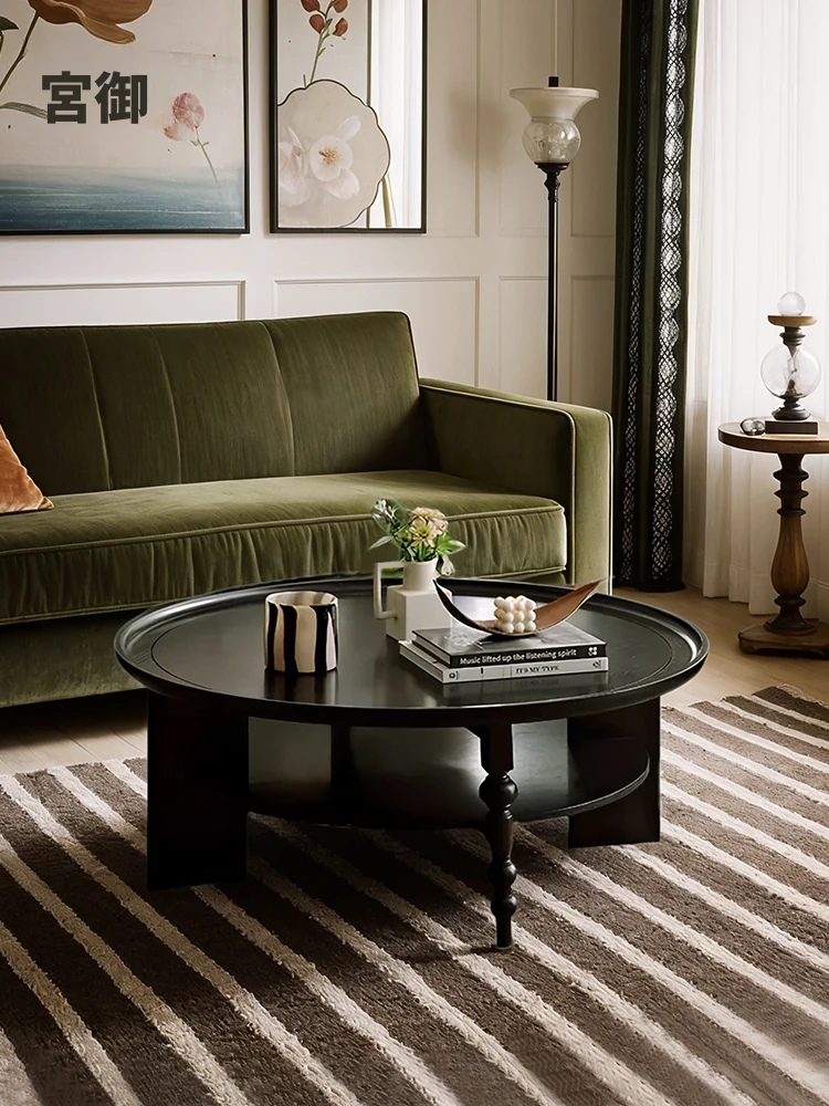 宮御露比フレンチビンテージスタイルの無垢材製ブラックラウンドコーヒーテーブル - 家庭用コンパクトサイズ、リビングにぴったりの2025年新作!