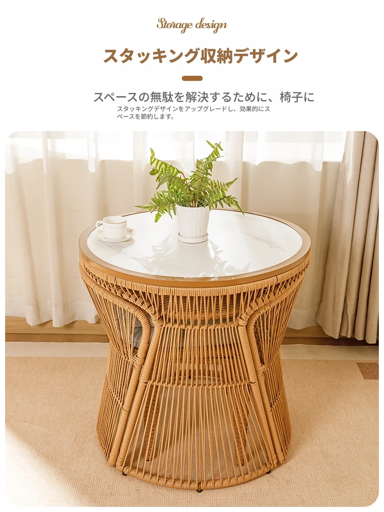 アウトドアテーブルセット - 庭やバルコニーに最適なリラックス空間!おしゃれなラタン製チェア3点セットで、ティータイムを優雅に楽しもう。ヴィラやガーデンにぴったりの休憩スペースを演出!