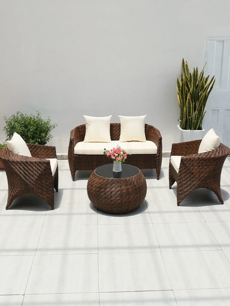屋外用テーブル&チェアセット|バルコニーや庭に最適なリラックスソファ|おしゃれなラタン編みデザイン|家庭用別荘にぴったりな茶卓&椅子の組み合わせ!快適なアウトドアライフを楽しもう!