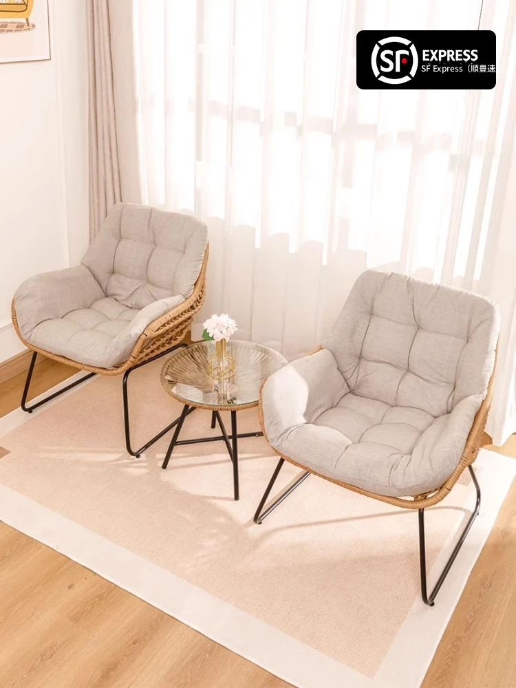 バルコニー用リラックスチェアセット|小型住宅に最適なティーテーブル&チェア3点セット|別荘やリビングにぴったりなラタン製!快適なひとときをお楽しみください!