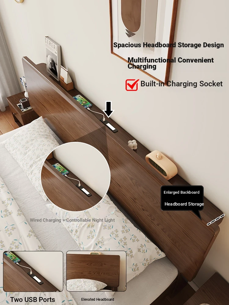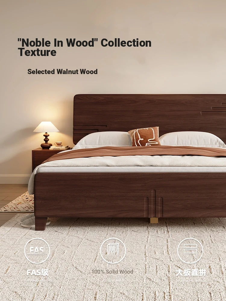 Modern Minimalist Solid Wood Bed for Master Bedroom - 1.8m Double Bed and 1.2m Single Bed Frame in Walnut Finish - Stylish and Durable Design for Your Home