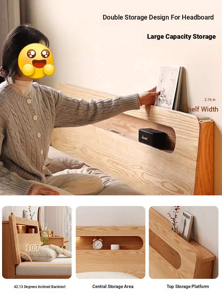 Nordic Solid Wood Bed - Modern Minimalist 1.5m & 1.8m Double Bed for Master Bedroom, Space-Saving High-Storage Gas Lift Bed for Small Apartments