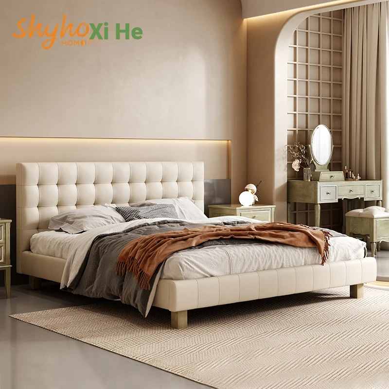 Xihe Creamy Luxury Double Bed - Modern Minimalist Wabi-Sabi Style, Elegant Leather Upholstered King Size Bed for Your Dream Bedroom