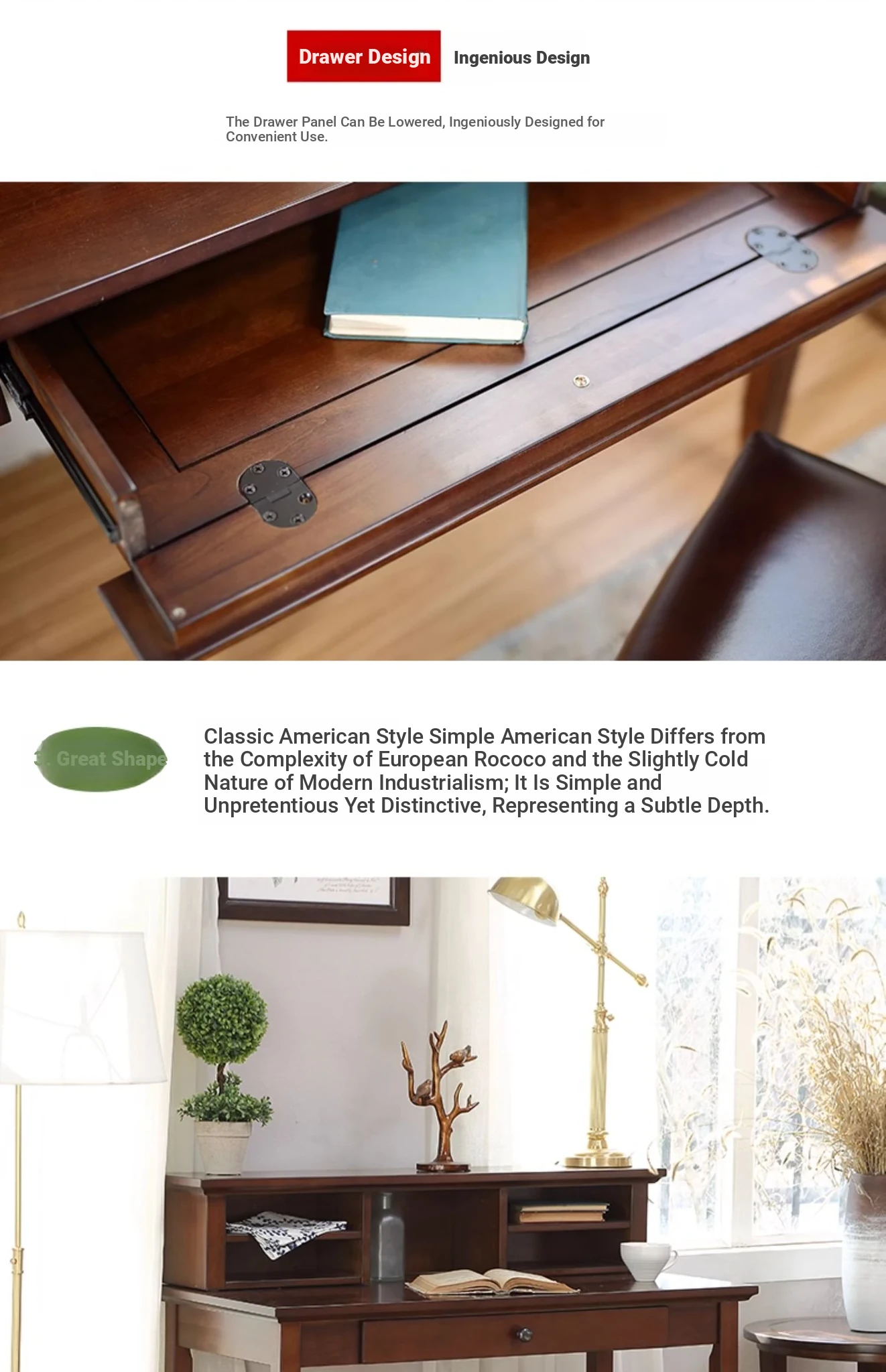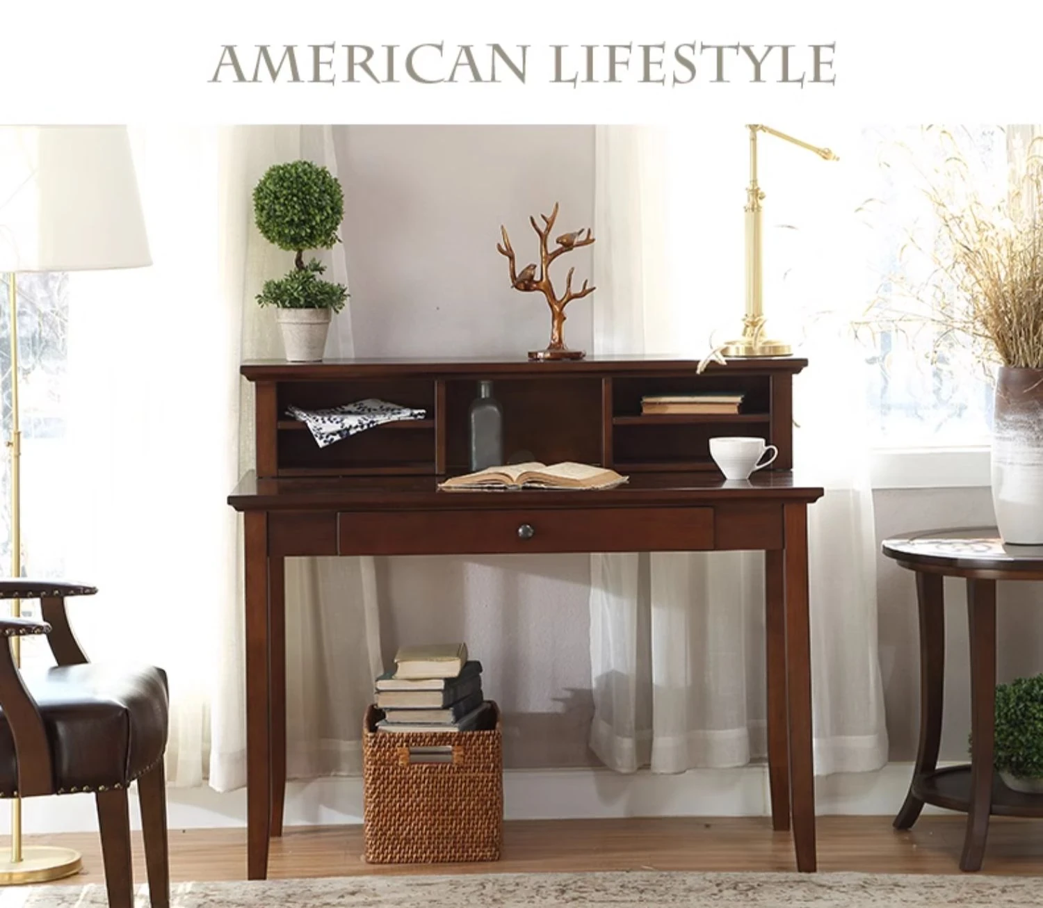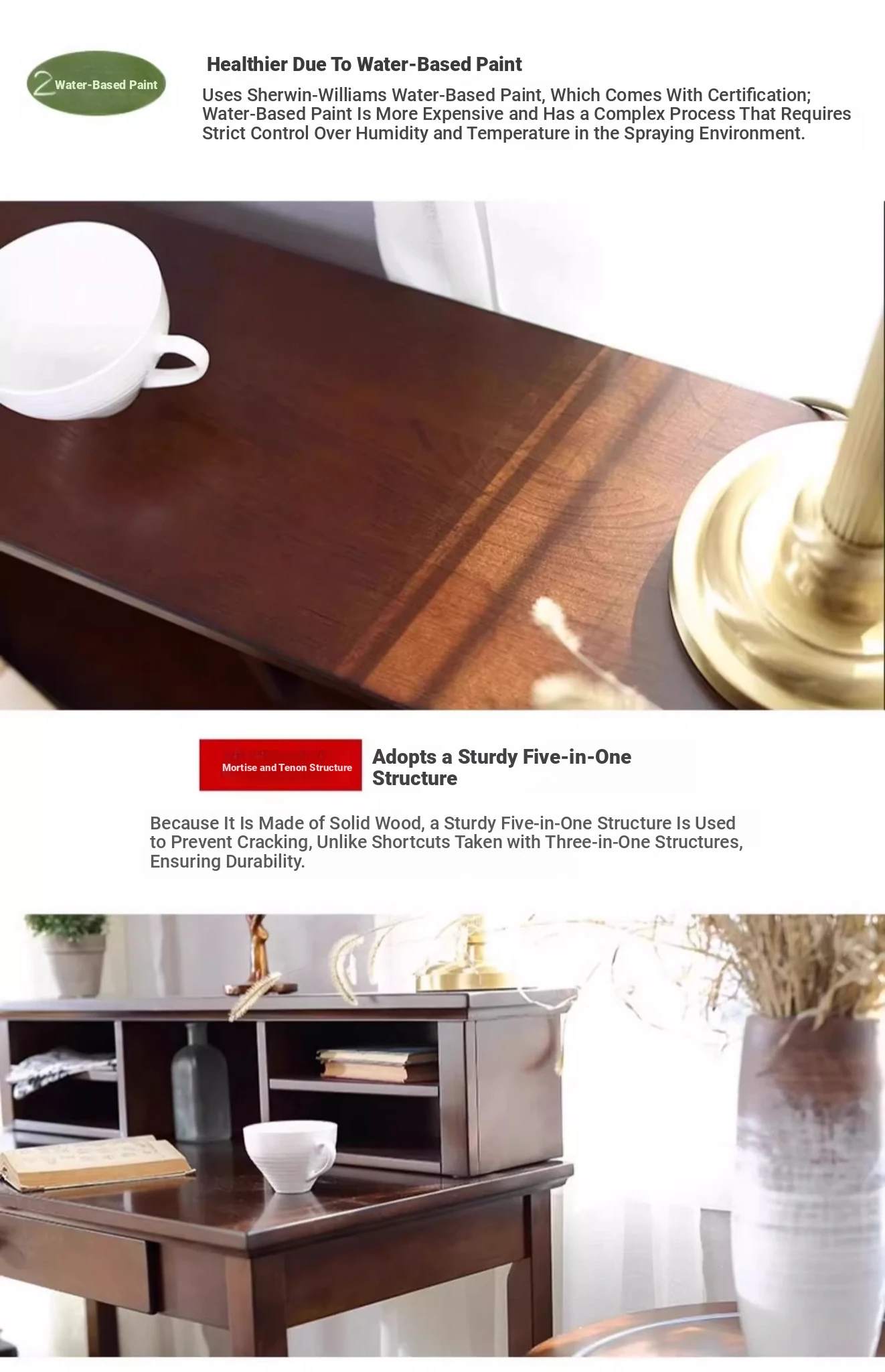 American Vintage Minimalist Solid Wood Desk and Bookshelf Set - Cherry Wood Home Office Writing Table and Study Desk